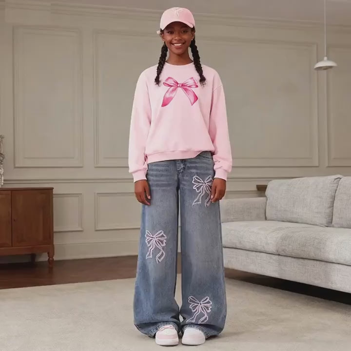 Girls' Teen Fashion Jeans with Bow Embroidery, Straight-Leg Wide Leg Pants for All Seasons Y2K Youngsters' Retrò Denim Elastic Waistband Comfortable Fabric Casual Outing Travel Party Christmas Halloween, Cute Jeans, Jeans Shorts, Pantalon Jeans, Holiday Outfits, Seasonal Fashion, Durable Jeans, Comfortable Material, Embroidered Pants, Young Teens, Youth Apparel, for Teenager